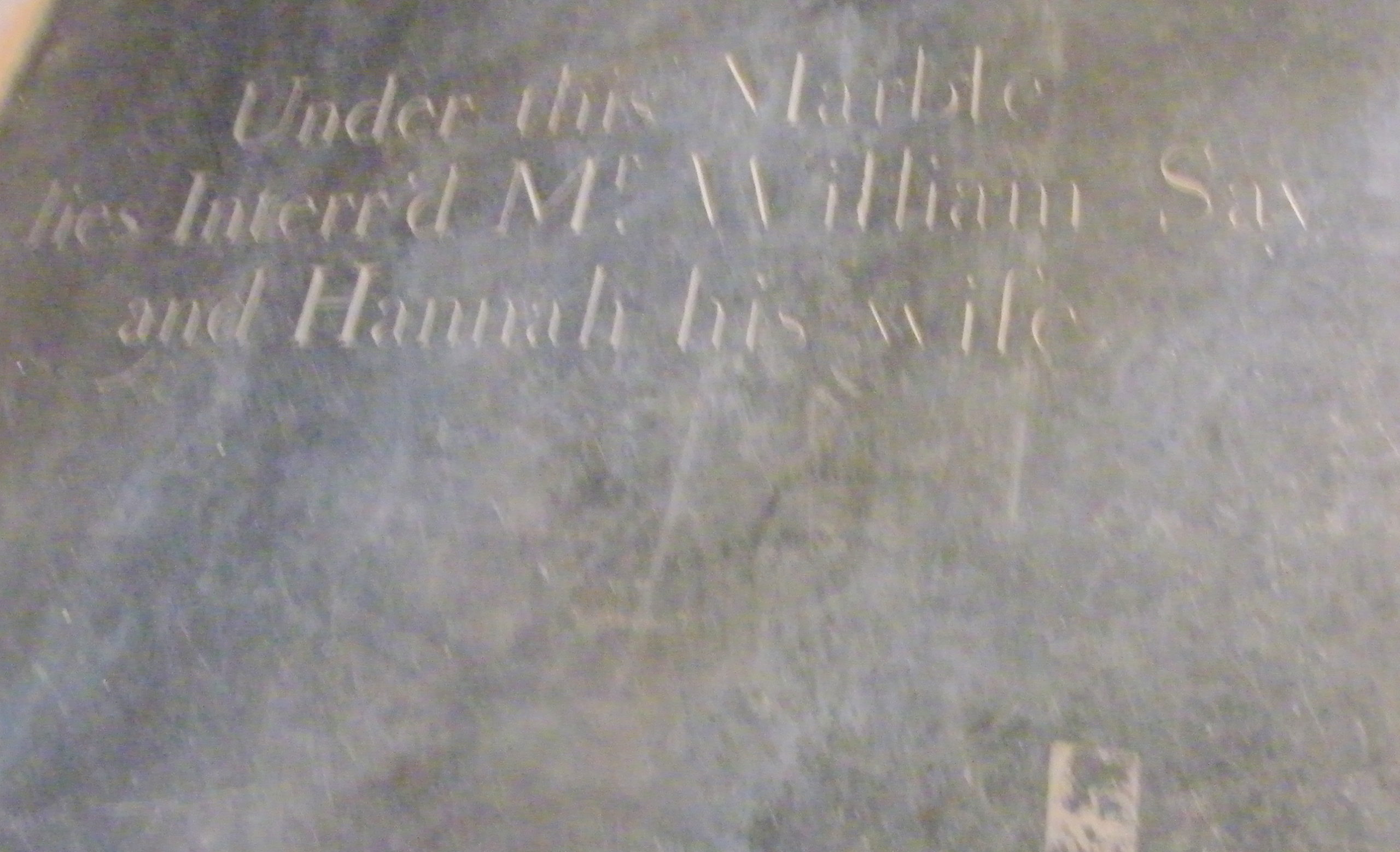 On the floor of the church between Mr William Say , above, is the ledger of Ann wife of Cornelius Carr, junr