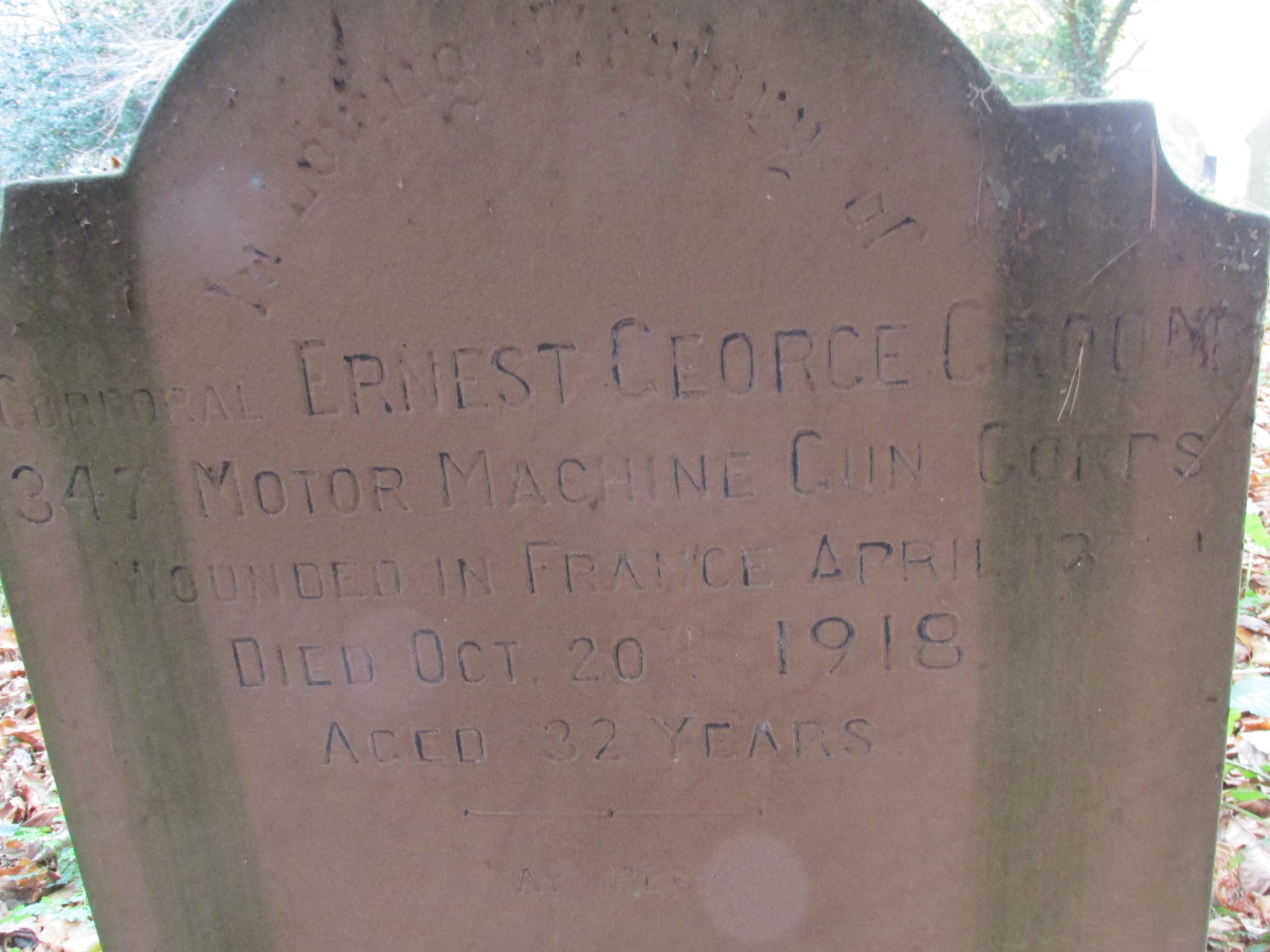 GROOMErnest George , son of Henry and Matilda , of Parsons Lane, grocers porter , born Crimplesham . enlisted Motor Machine Gun Service , RA , and later 6th Battalion Machine Gun Corps ; the Motor Machine Gun Service RA was motorised by motor cycles with sidecars , and armed with Vickers Machine Guns . In the 1911 census for Bridge Road , Ernest was living with his three sisters , they were dressmakers and a council teaching assistant , and he was working as a cycle and motor mechanic . Died of wounds at home 20th Oct 1918 aged 31 following the last battles of the Hindenburg Line . Grave reference 37.12.. Awarded British War and Victory, and 14 Star medals.