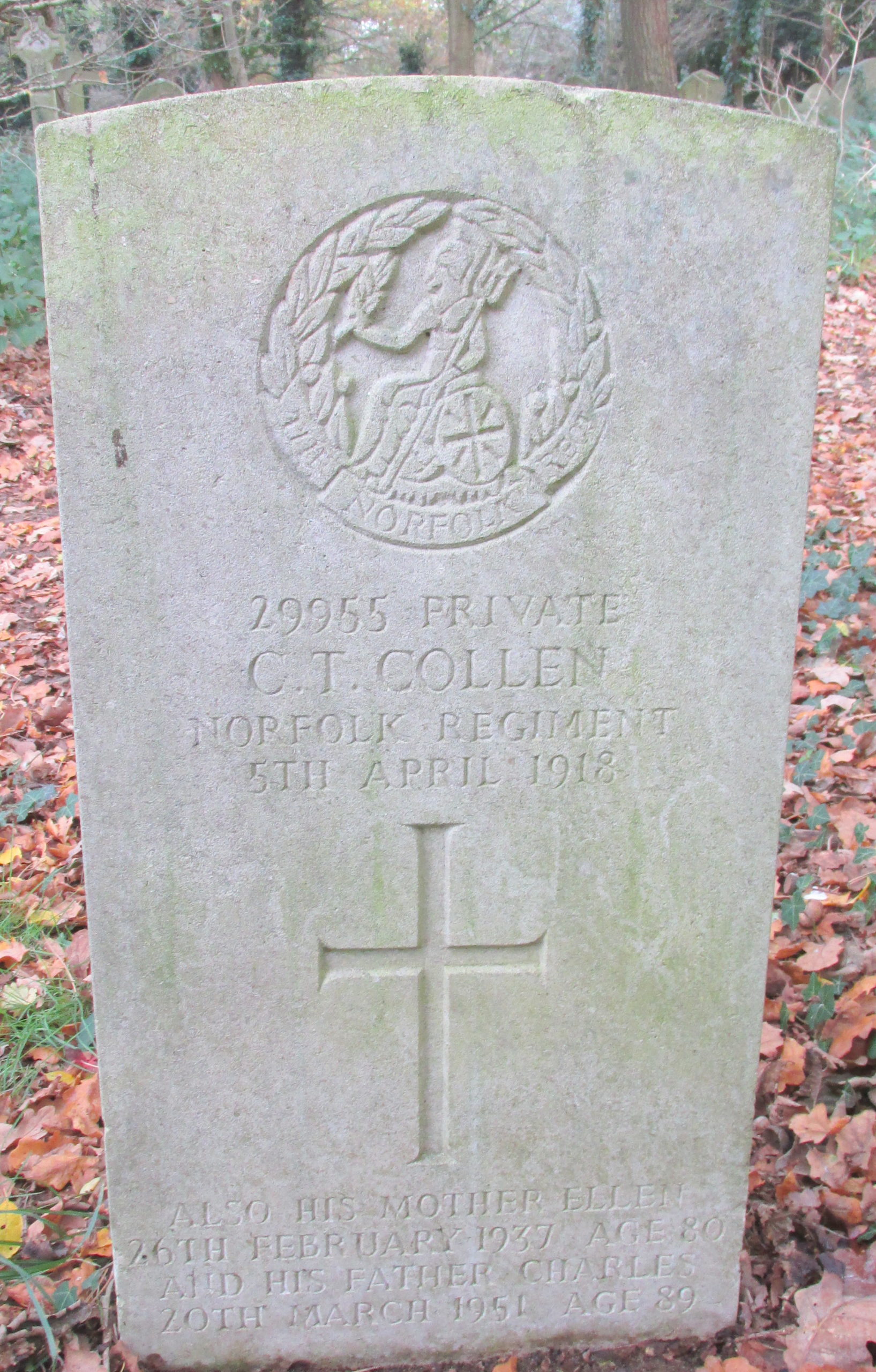 COLLENCharles Thomas was the son of Charles Collen and his second wife Ellen , of The Queen’s Head , Bridge St, and later of York Villas . He enlisted with his older brother Sidney in Sept 1914 and joined the 9th Battn Norfolk Regiment . He is listed as wounded in the regimental casualty lists after 21st March 1918 , the first day of the last Spring Offensive , and was evacuated to 1st Southern General Hospital in Stourbridge . His right shoulder was operated on to removed shrapnel on 2nd April , but he suffered a sudden collapse and died there on 5th April 1918 . He was brought home and is buried in Downham King’s Walk Cemetery . The War Diary gives this account . “Lagnicourt Sunken Road . At 5 am the enemy heavily bombarded our system with gas and heavy calibre shells and an attack was evidently imminent . This bombardment continued intensely all day obliterating our front and close support lines also Strong Points . Owing to the heroic resistance of our men the enemy had only penetrated our front and close support lines up to 12 pm . This was due to the overwhelming numbers of the enemy and the obliteration of our system of defence . Our support company C Coy , did very gallant work in Skipton Reserve holding on till 5 o’clock then when both flanks had gone and not until then did they retire . Previous to this a very gallant counter attack was launched by the company in reserve going forward from Sunken road Lagnicourt to Skipton reserve . This and other persistent efforts of the men in Skipton reserve must have entirely baffled the enemy as attacks there were given up and he confirmed his attacks to Lagnicourt and the flanks . They being successful our men in Skipton had to retire owing to their part of the line being exposed to great danger . 22nd March 1918 . The battalion HQ and remainder of the officers and men then took up positions in the Morchies Vaux line . “ . (photo copyright N Brunn)