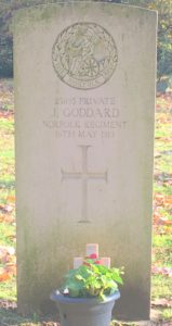 GODDARDJohn , son of Fred and Fanny Goddard, house painter of Windsor St , Downham; auctioneers labourer , married Florence Dorman Dec 1/4 1907 , 2 daughters , living Church Road . joined 28th May 1916 at Norwich , 3rd Reserve Battalion Norfolk Regiment , discharged physically unfit for service due to his left shoulder being damaged by a gunshot wound , on the Somme battlefield , admitted to Etaples for 2 days , and sent home in 1916 to spend 3 1/2 months at Gosford War Hospital , Northumberland , and later Ripon hospital ; discharged 5th April 1918 ; widow awarded 22/- per week and 12/8d for their three children . Died 21st May 1919 buried Downham Market , grave reference 10.31. Awarded British War and Victory medals.