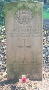 GODDARDWilliam Smith , brother of the above , b 1888, working as an hotel boy in 1901 , and as a corn porter , living in Railway Road, 1911 . Enlisted 28th Sept 1914 9th Northamptonshire Regiment , sent to France 1916 , discharged unfit for further service 25th Oct 1918 , chronic laryngitis June 1917 possibly gassed . HIs medical record shows his later address as Flour mill, March .. Died at Downham 8th January 1919 possibly in the influenza pandemic ; grave reference 10.40. . Awarded British War and Victory medals.