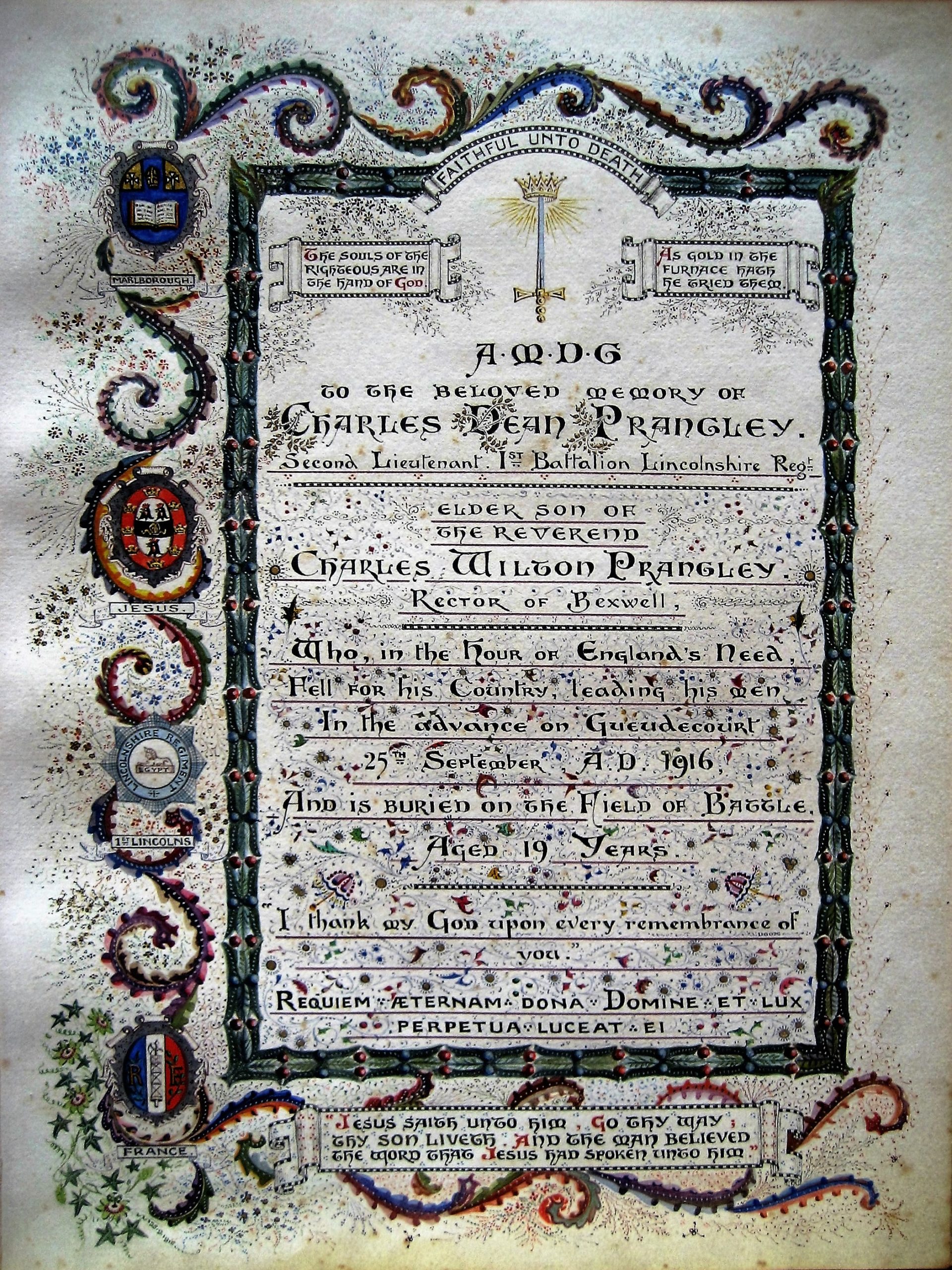 Charles’ father remarried in 1902 in the Kensington district to Elizabeth Reid [and had a further three children between 1904 and 1911 ]and perhaps it was close to this date that Charles started school at South Lodge, Lowestoft . He entered Marlborough College on 1st Jan 1911 . He left in July 1915 having won a place to study at Jesus College Cambridge. He was commissioned into the Special Reserve of Officers on 11th Aug 1915 , and left for France on 13th July 1916 where he joined the 1st Battalion Lincolnshire Regiment on 19th July at Buire .