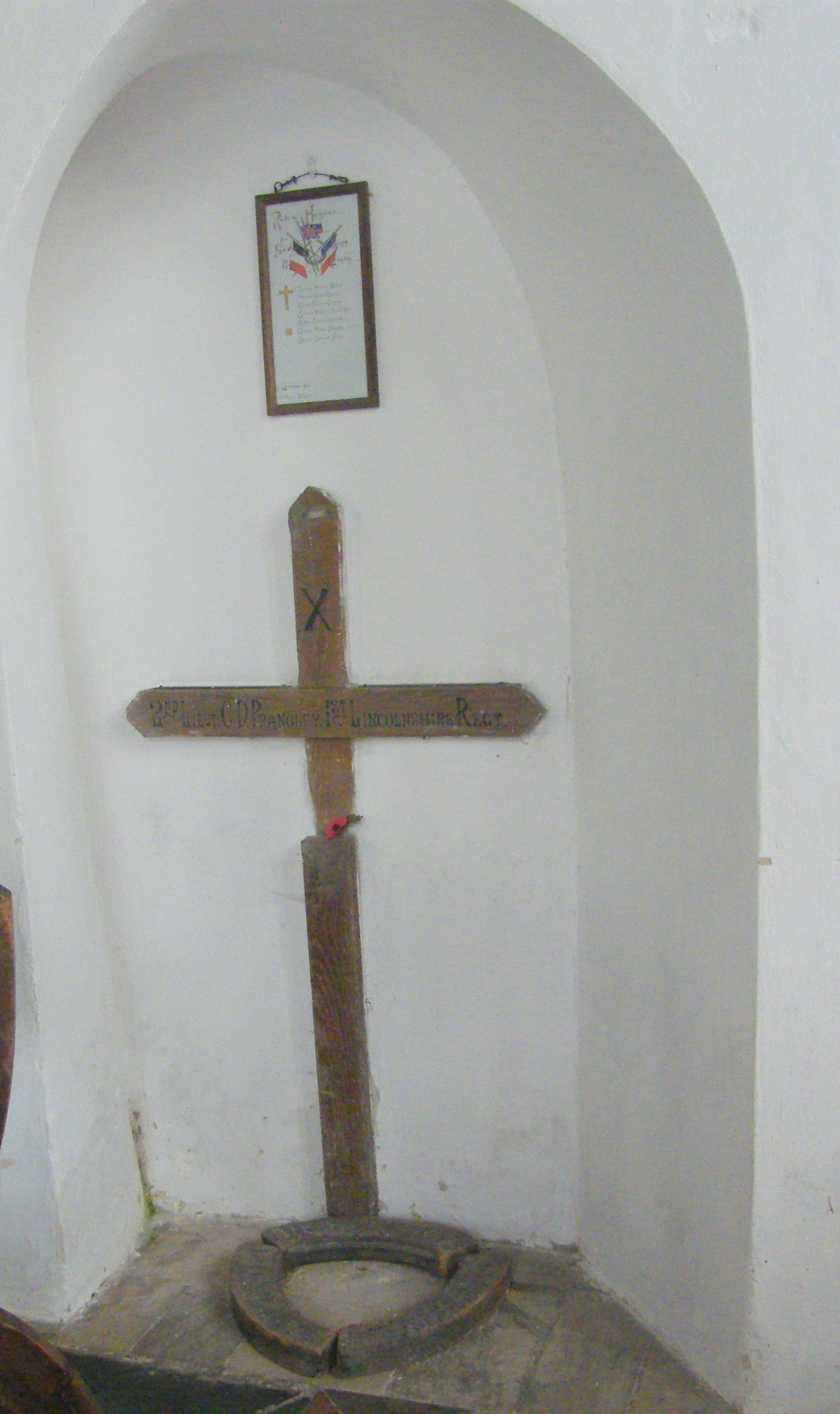 His body was marked with a wooden battlefield cross which was brought back to his family at Bexwell . It is today in a niche in the church . He is buried in Les Beoufs cemetery .