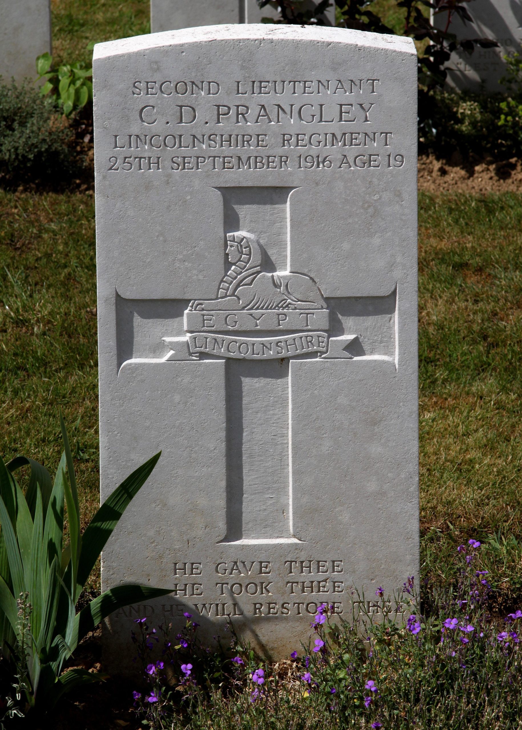 The above picture is Charles Dean Prangley’s grave at Lesboeufs cemetery. The inscription reads. He gave thee , He took thee, He will restore thee.
